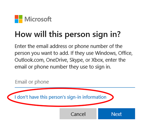 4. In the next pop up window, select [I don't have this person's sign-in information]: