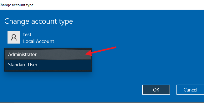 8. Change the account type from [Standard User] to [Administrator]. Then click [OK].